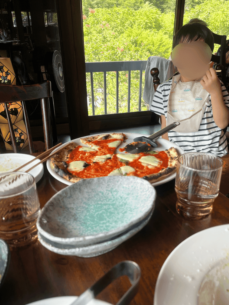 川遊びを満喫したあとは最後の片付けをしてチェックアウト。そして、キャンプ場のすぐ隣にある「古民家ひらぬま」へ早めのランチに行きました。築130年の古民家を利用したイタリアンカフェで、石窯で焼くピッツァと創作パスタをいただきました。雰囲気も料理もとても素敵で大満足。