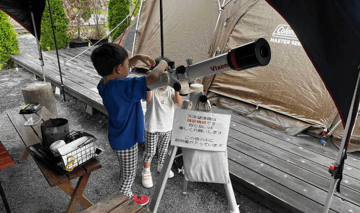 食後には、キャンプ場で天体望遠鏡を借りて星空観察にも挑戦してみました。せっかく自然の中にいるので、星をきれいに見られたら最高だなと思ったのですが…説明書を読んでもピントをうまく合わせることができず、残念ながら断念。天体望遠鏡の操作って思っていた以上に難しいものですね。