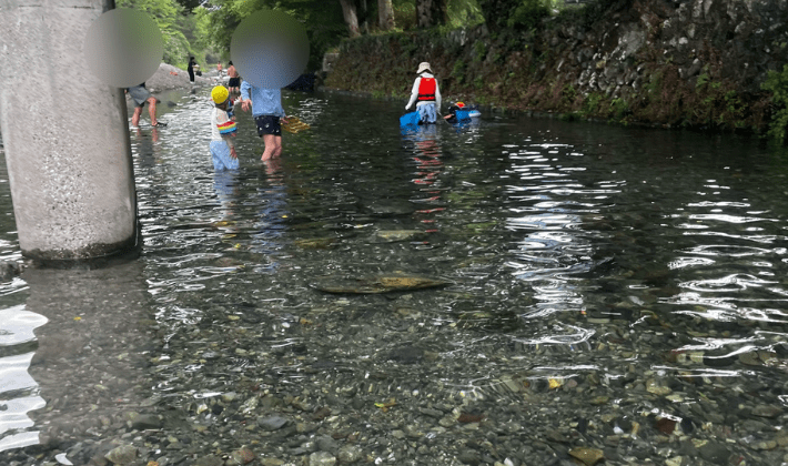水はひんやりと冷たくて、暑い夏にはたまらない気持ちよさでした。川の中をよく見ると小さな魚もいて、子どもたちが捕まえようとしていましたが、動きが素早くてまったく捕まえられず(笑)。それでも大興奮でした。