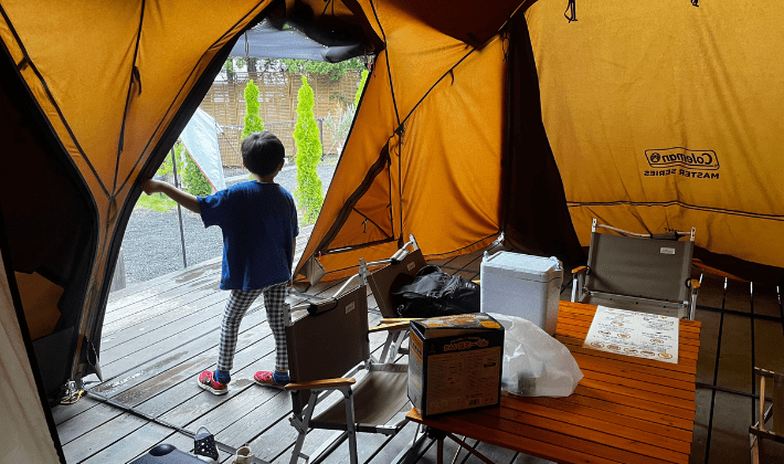 今回我が家が選んだのは常設テント。テントの設置作業がないのでとても楽で、到着してすぐに荷ほどきに集中できました。
